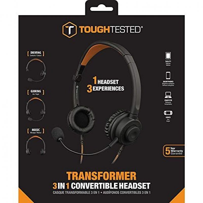 ToughTested Transformer wired headset with removable boom mic is the first ever stereo headset that converts for 3 different uses: driving, gaming and music. Compact design makes all components easy to carry along on the road or just about anywhere you go.